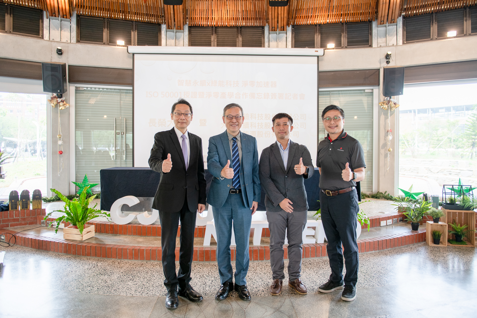 【記者黃緒勳台南報導】台灣檢驗科技股份有限公司鮑柏宇副總裁、長榮大學李泳龍校長、大云永續科技股份有限公司胡逸鑫總監、翰可能源股份有限公司袁錦湘經理,三家公司都與長榮大學簽署產學合作備忘錄。(